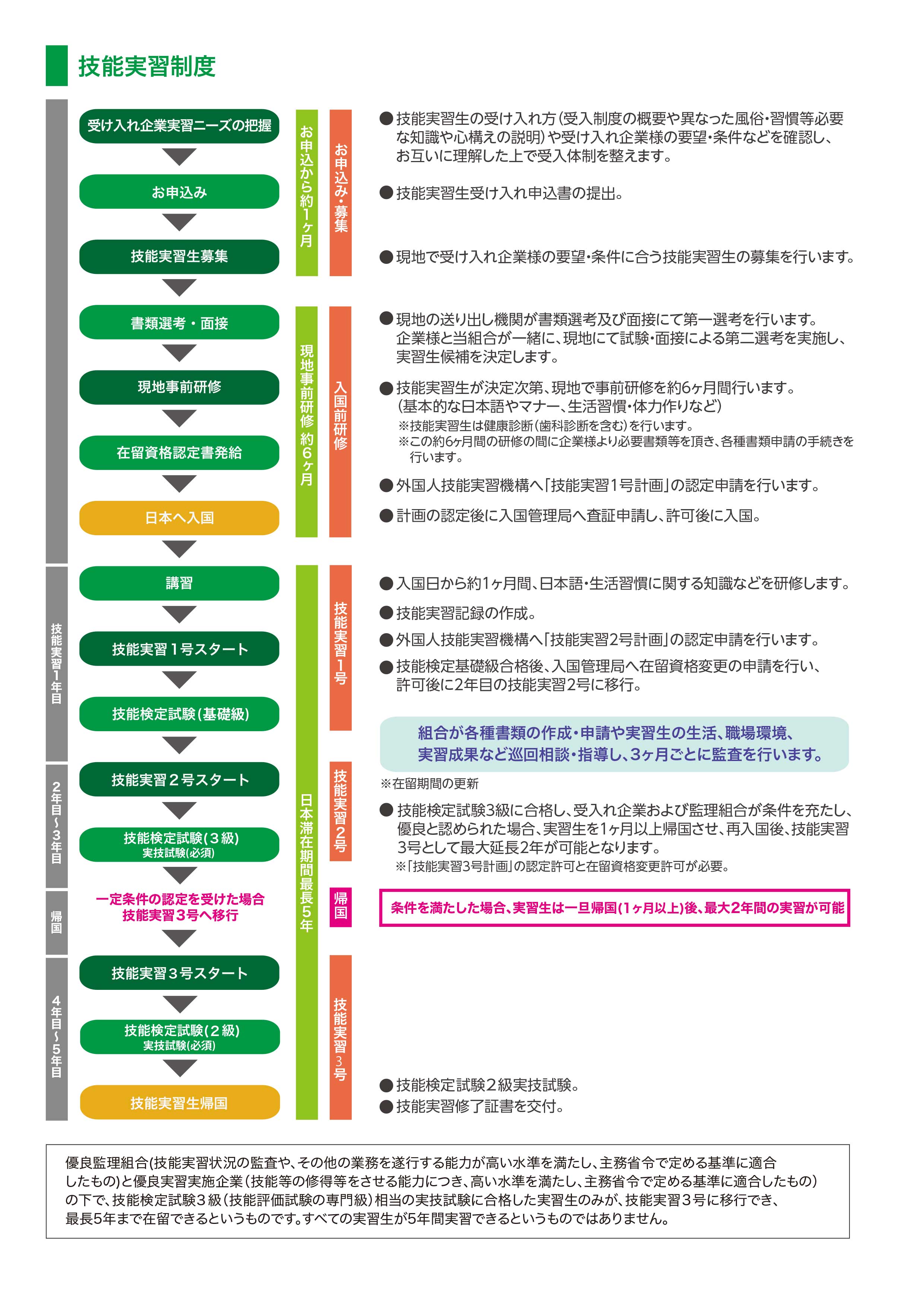 当初の技能実習期間は1年間で,その成果が一定水準以上に達したことが技能検定等で認められた場合,更に2年間の技能実習を行うことができます。 3年間の技能実習はすべて受入れ企業との雇用関係のもと行われます。 また,優良な監理団体と実習実施者に限り3年間の技能実習を修了後に,更に2年間の技能実習(4年目~5年目)が可能となります。